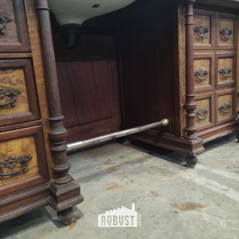 Het meubel ademt vakmanschap. Het blad is van zwaar marmer, met daarin twee originele wastafels en de bijbehorende zeepkraan. Bovenop een statige spiegelwand – de spiegels zijn vernieuwd, maar sluiten perfect aan bij het originele karakter. Onder het blad vind je een zee van ruimte: meerdere lades (vroeger had elke vaste klant er zijn eigen) én een bergvak achter valse frontjes. Praktisch, slim en typisch voor de barbiers van toen.
