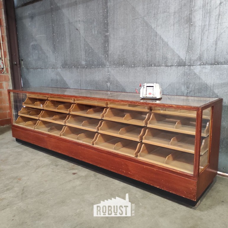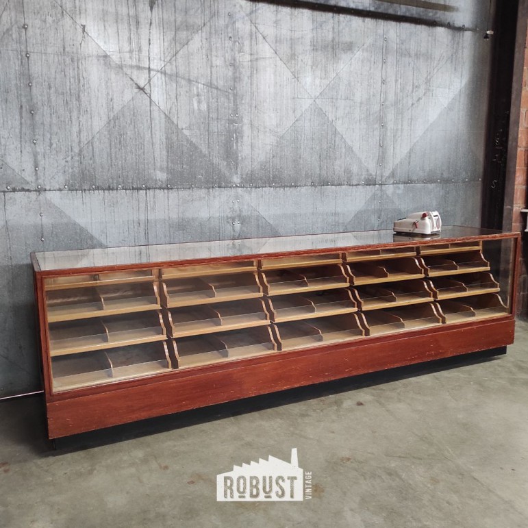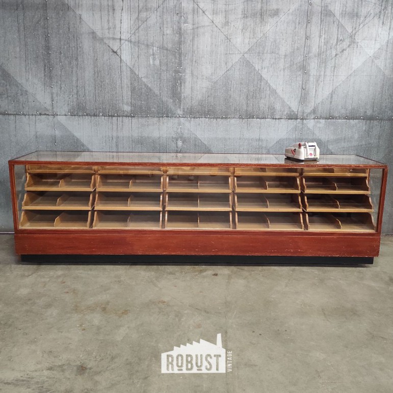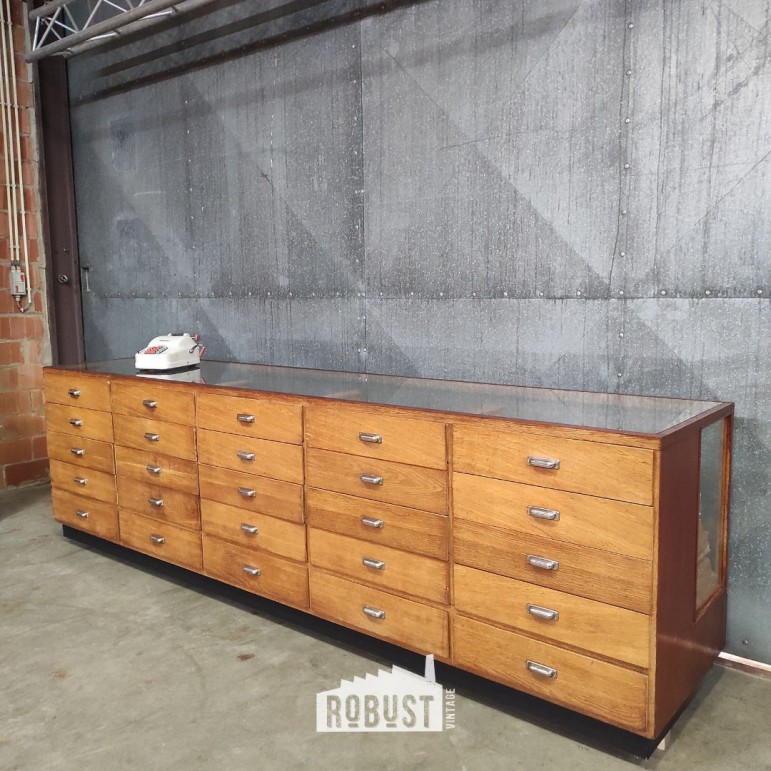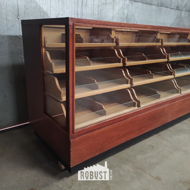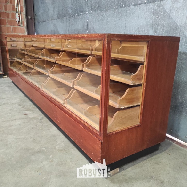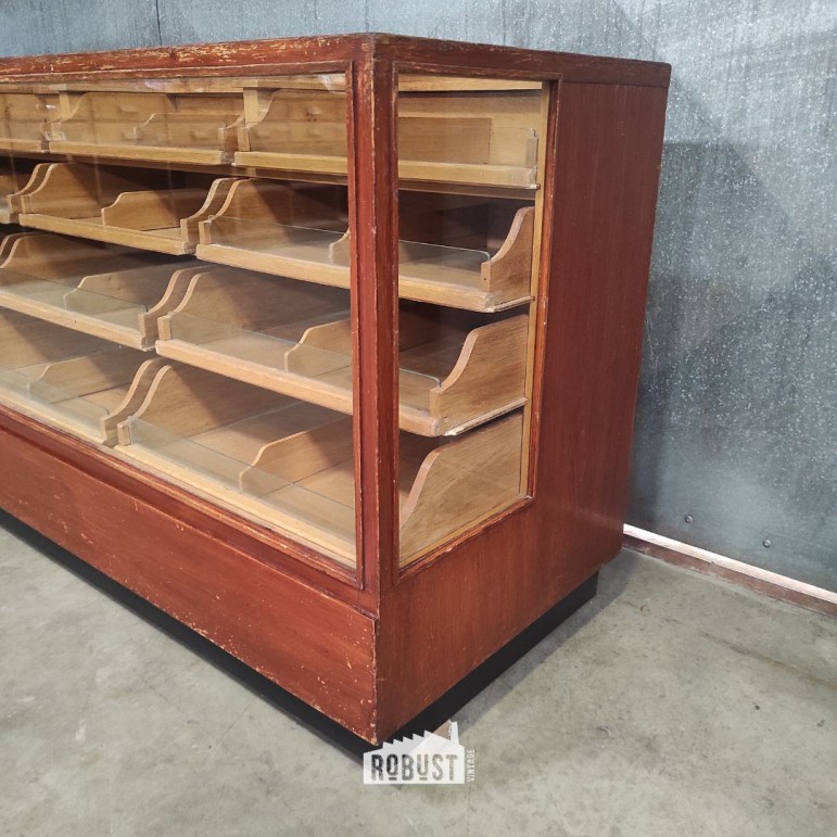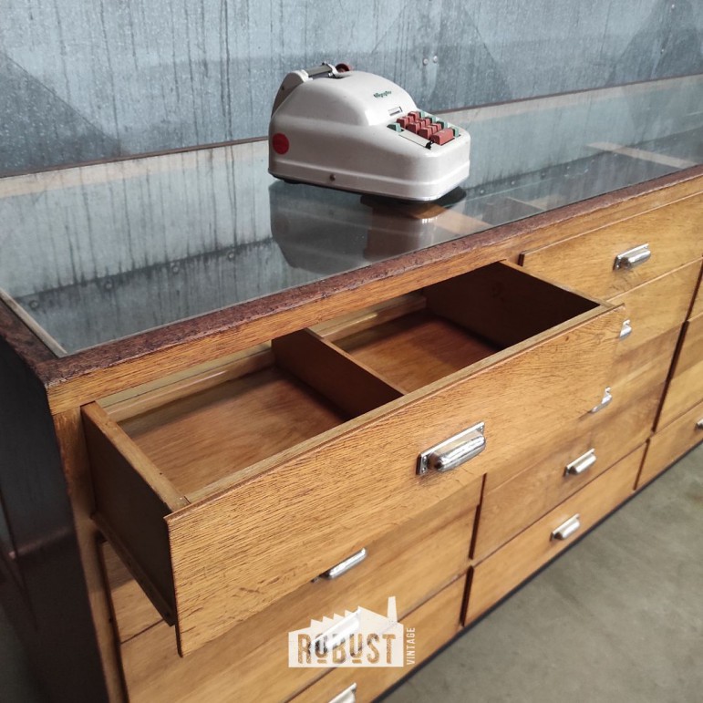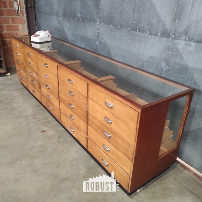 De toonbank ademt pure winkelcharme. Voorzien van maar liefst 20 grote display-lades om producten zichtbaar te presenteren, én 5 verborgen lades voor voorraad of persoonlijke spullen. De lades schuiven nog soepel, en het hout toont een prachtig doorleefd patine dat alleen tijd kan creëren.
