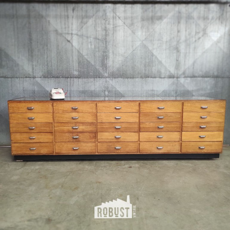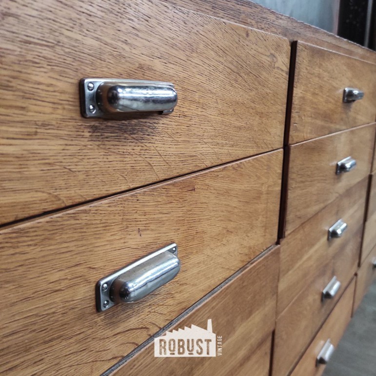 20 grote display-lades – ideaal om stoffen, accessoires of kleine objecten overzichtelijk te tonen.