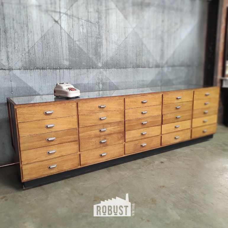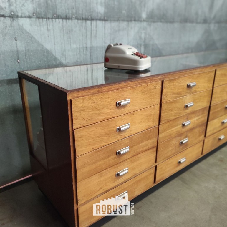 Sommige meubels zijn geboren om te dienen, en blijven dat generaties lang doen. Deze grote fourniturentoonbank (295x60x85 cm) komt uit een Duitse kledingwinkel waar in de jaren 1960 stijlvolle merkkleding werd verkocht. Een toonbank met geschiedenis, gebruikssporen én karakter – precies zoals we het graag zien bij ROBUST.