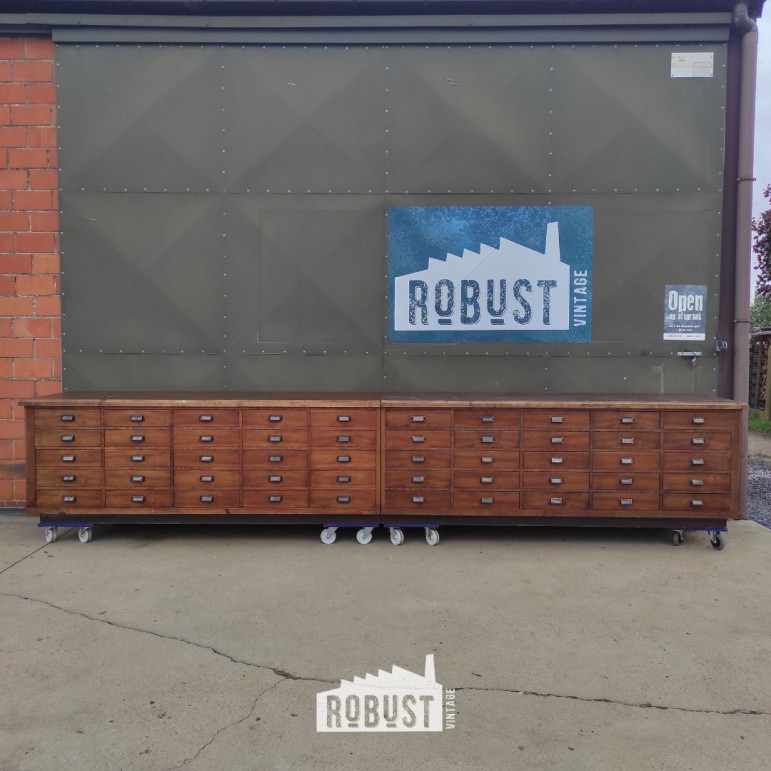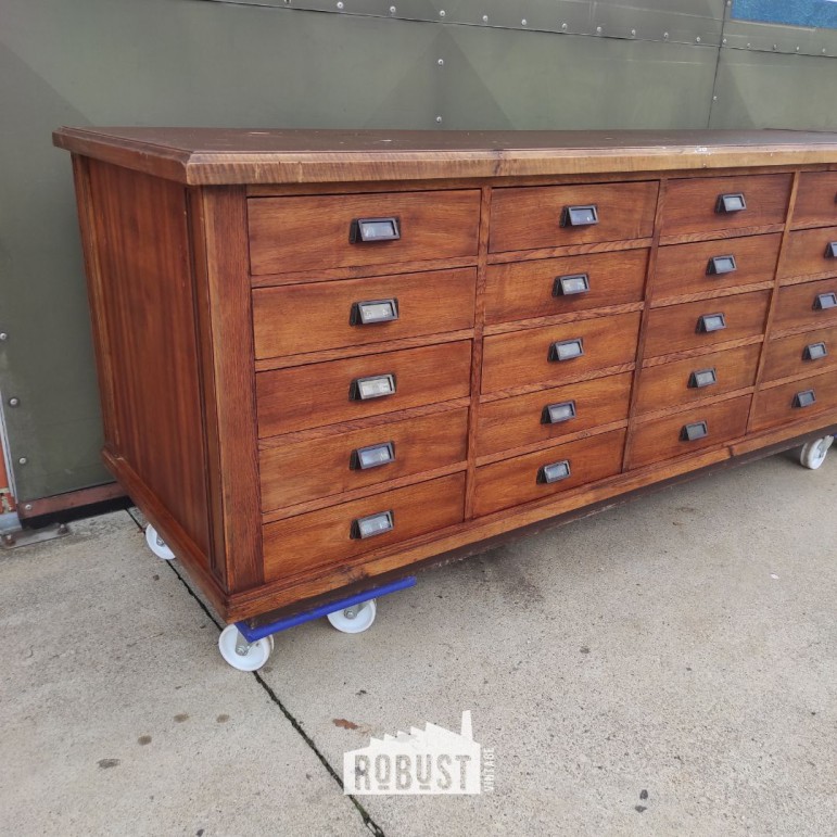 Een meubel dat meteen indruk maakt door zijn formaat én zijn eenvoud. Deze lange ladekast (450x75x80 cm) komt uit een oude werkplaats en bestaat uit twee delen die samen één mooi geheel vormen. Handig voor transport, maar vooral indrukwekkend wanneer ze weer naast elkaar staan: een toonbeeld van ambacht en degelijkheid.