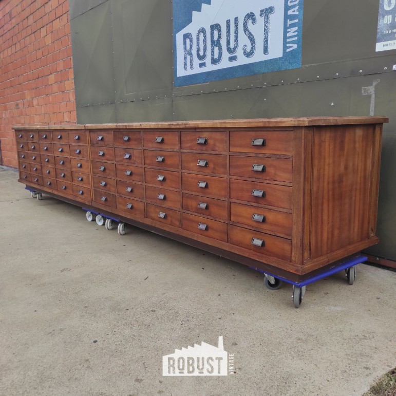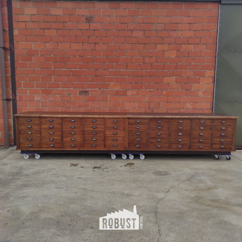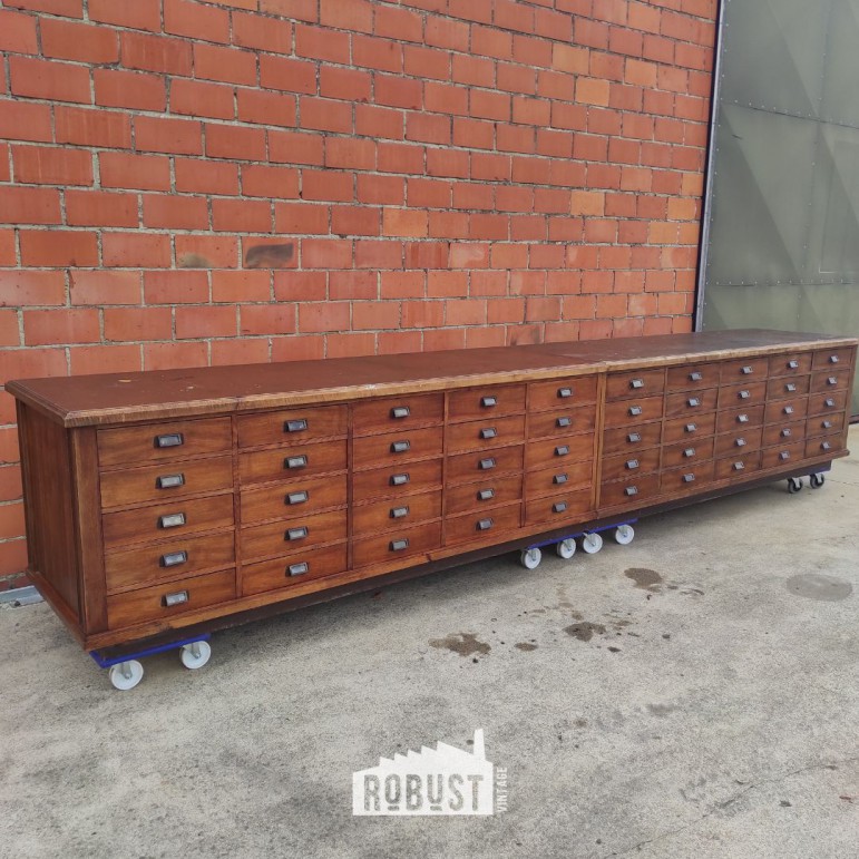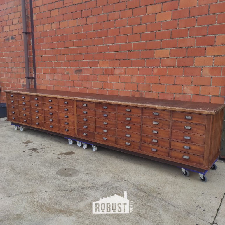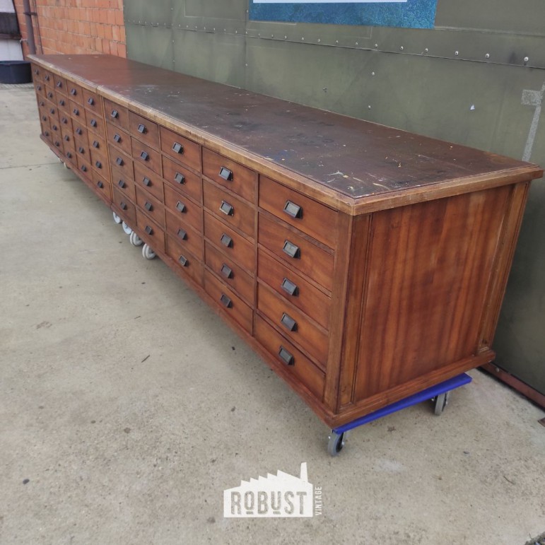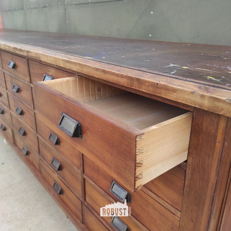 Lange ladekast – vintage toonbank of apothekerskast uit werkplaats, 450 cm