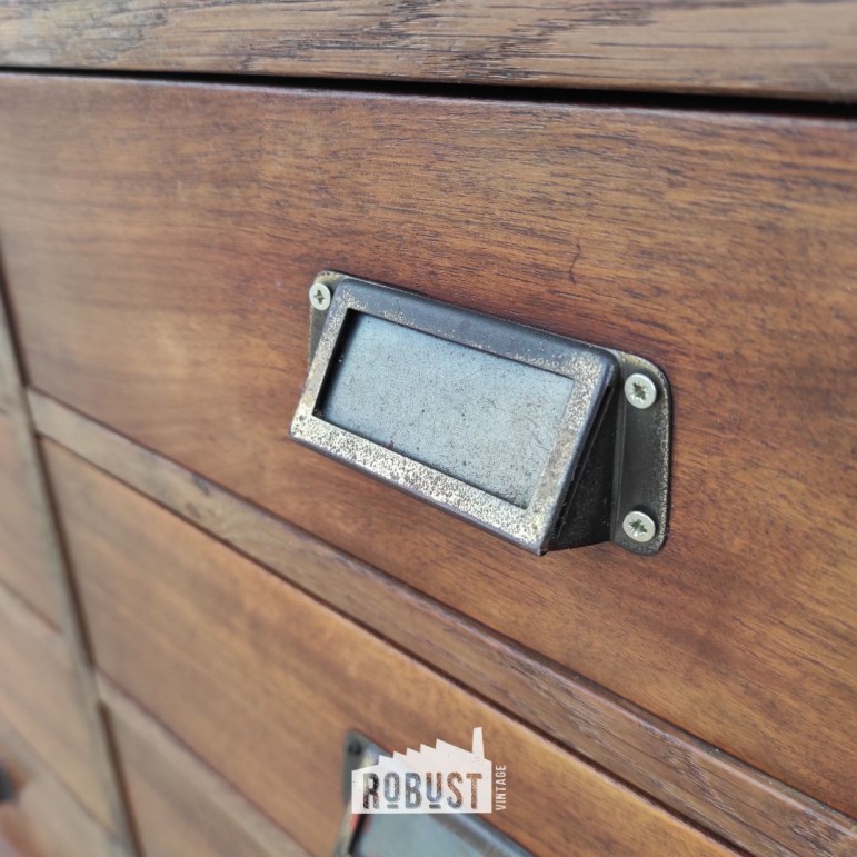 De kast telt veel grote, ruime lades – perfect om alles overzichtelijk op te bergen: gereedschap, voorraad, servies of papierwerk. De metalen handgrepen en de doorleefde houten fronten geven hem dat authentieke industriële karakter dat je niet kunt namaken.