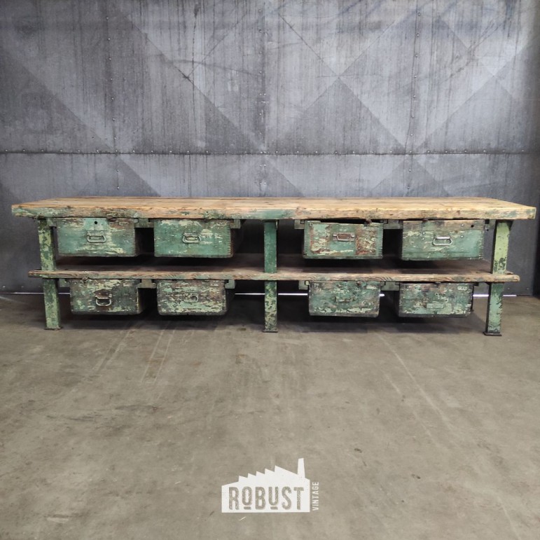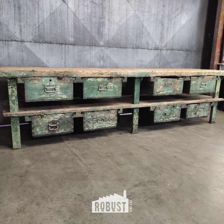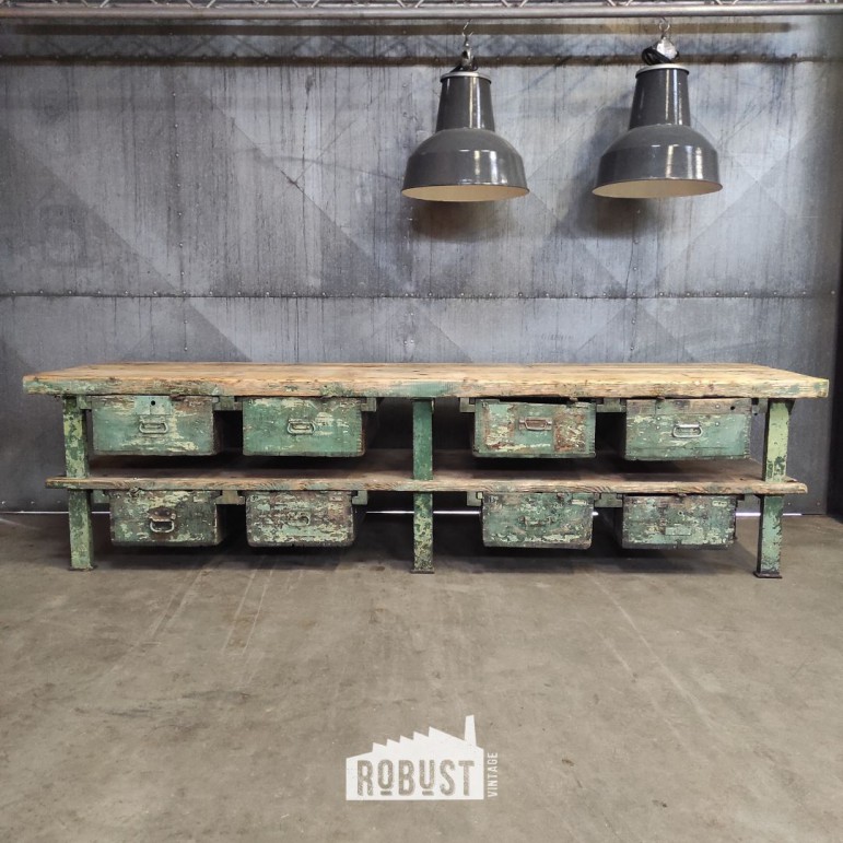 Grote industriële werkbank 330x88x86 cm met 8 lades, metalen frame, groen patina en geschuurd werkblad. Perfect als werkbank, toonbank, keukeneiland of displaymeubel.