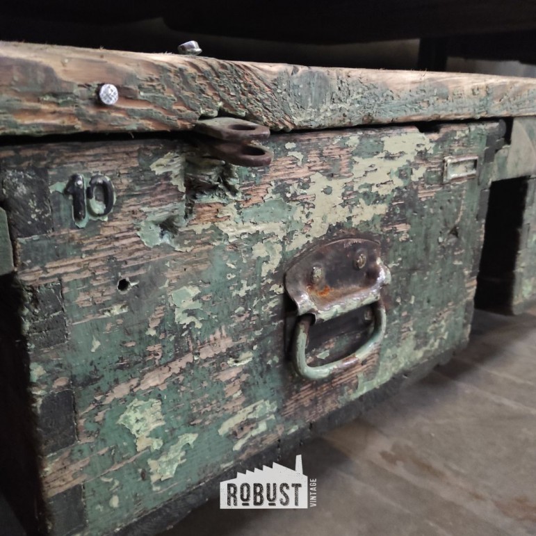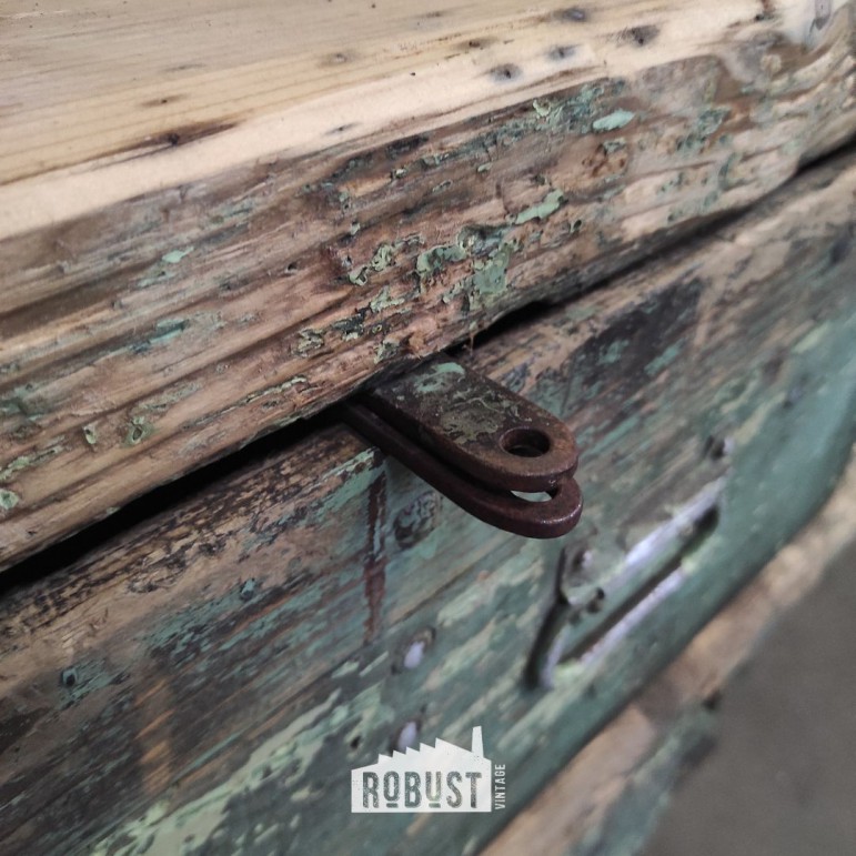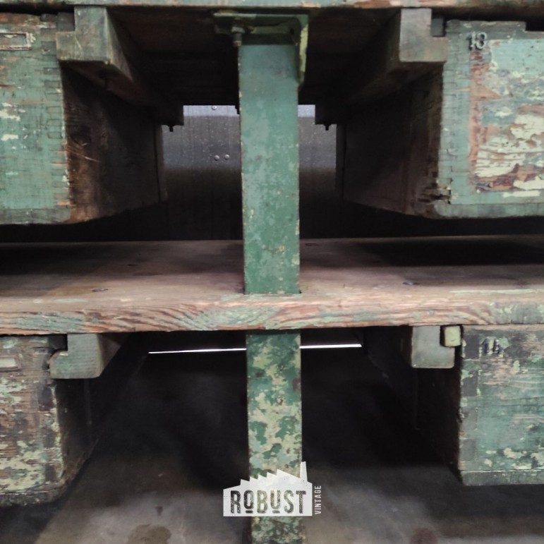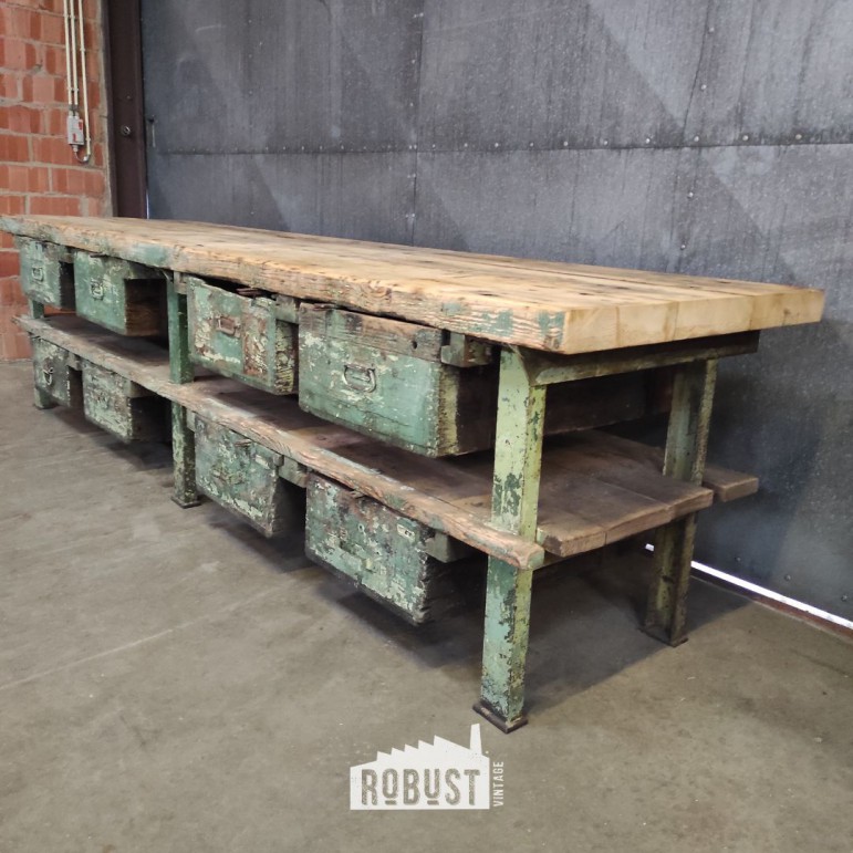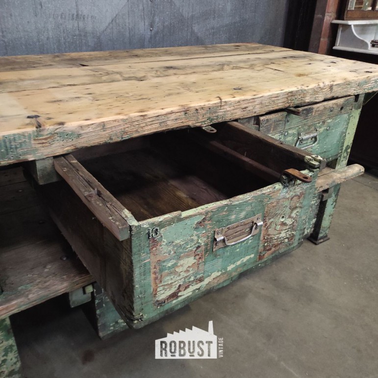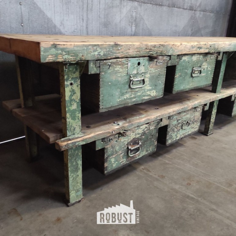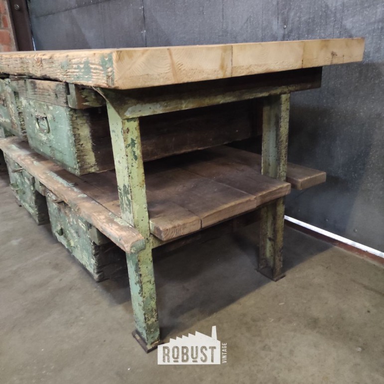 Grote industriële werkbank – metalen ladekast met groen patina en massief werkblad