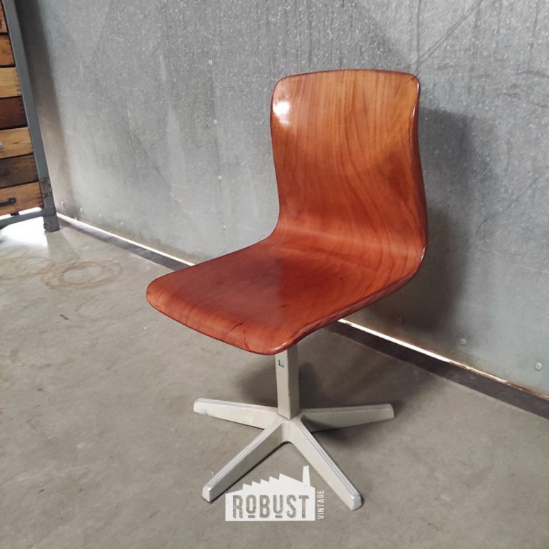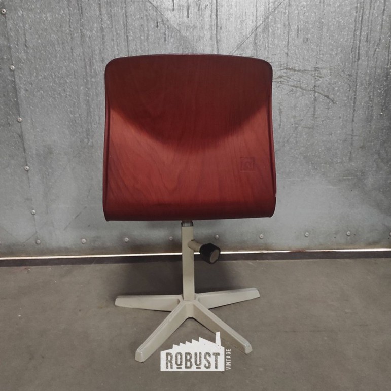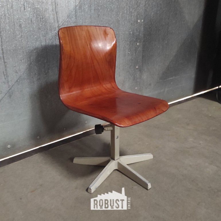 Deze verstelbare Pagholz kinderstoel van Thur-Op-Seat is een mooi voorbeeld van hoe goed schoolmeubilair vroeger gemaakt werd. Eenvoudig van vorm, stevig in gebruik en met net dat beetje karakter dat hem vandaag opnieuw interessant maakt. De roodbruine Pagholz zitting is mooi bewaard en combineert sterk met het lichtgrijze metalen onderstel.