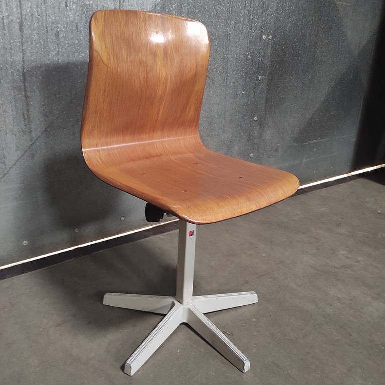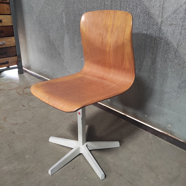 De zitting is gemaakt uit dat typische industriële gevormde hout dat je vaak ziet bij schoolmeubilair uit de jaren 60 en 70. Sterk, licht veerkrachtig en gemaakt om jarenlang mee te gaan. Dankzij het in hoogte verstelbare onderstel groeit deze kinderstoel gewoon mee — van lagere speelhoek tot iets hogere tafel.