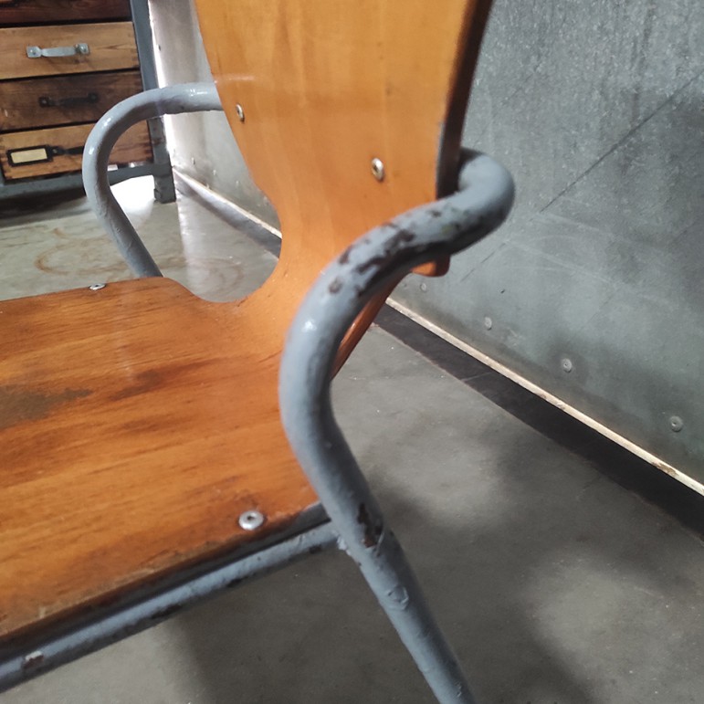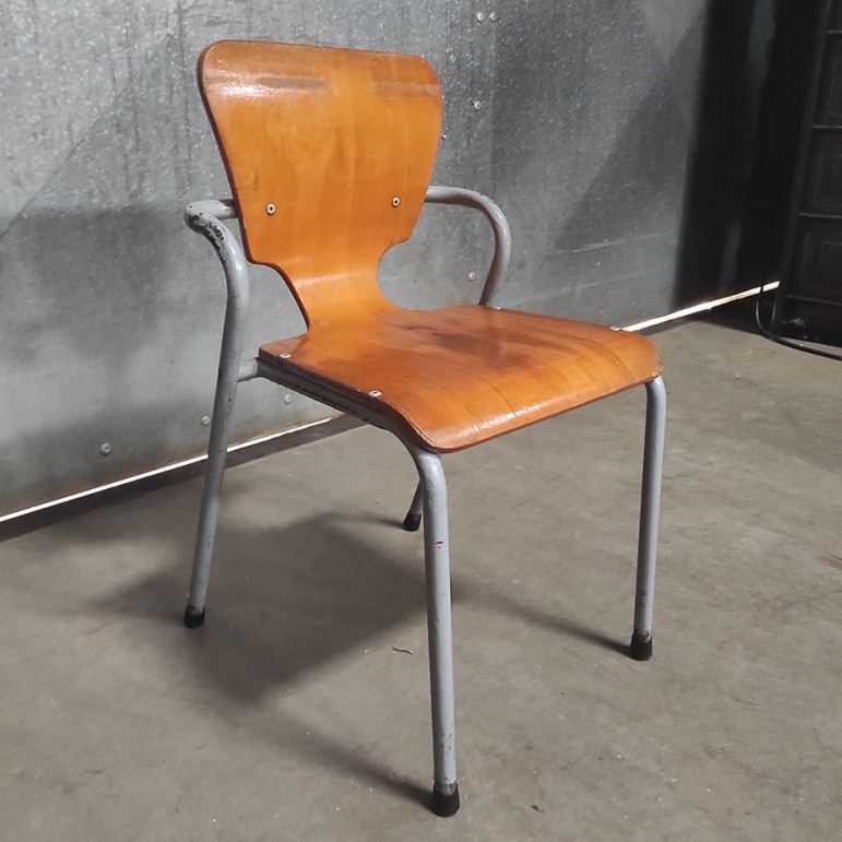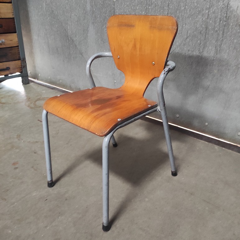 Industrieel kinderstoeltje met armleuningen – Belgisch schoolmeubilair