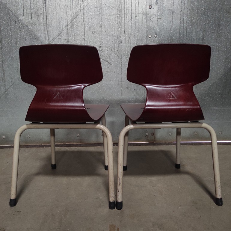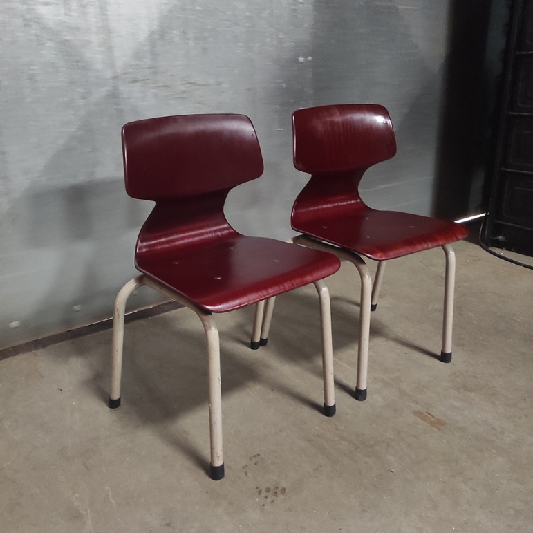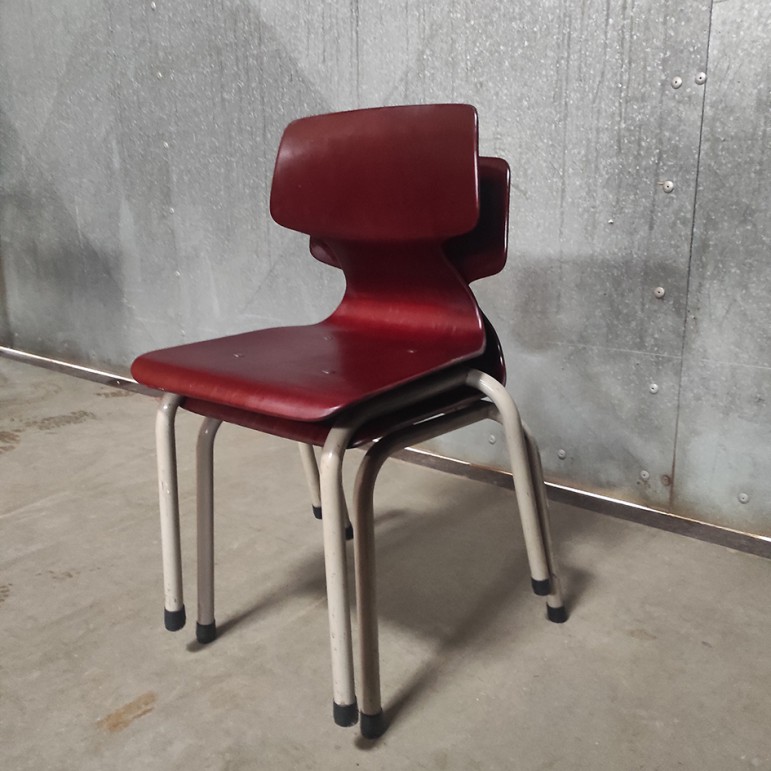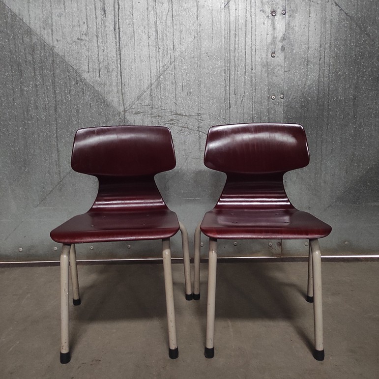 Het gaat om een stapelbare set van 2 kinderstoelen, zonder armleuningen, wat ze licht en praktisch in gebruik maakt. Met een zithoogte van ongeveer 33 cm zijn ze ideaal voor jonge kinderen, lage tafels of speelhoeken. Zoals je mag verwachten van origineel schoolmeubilair, zijn ze gebouwd om tegen een stootje te kunnen.