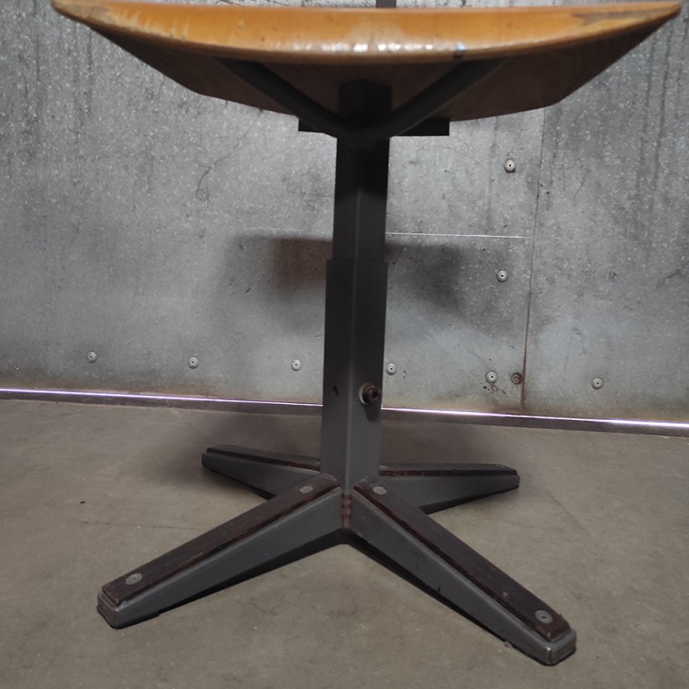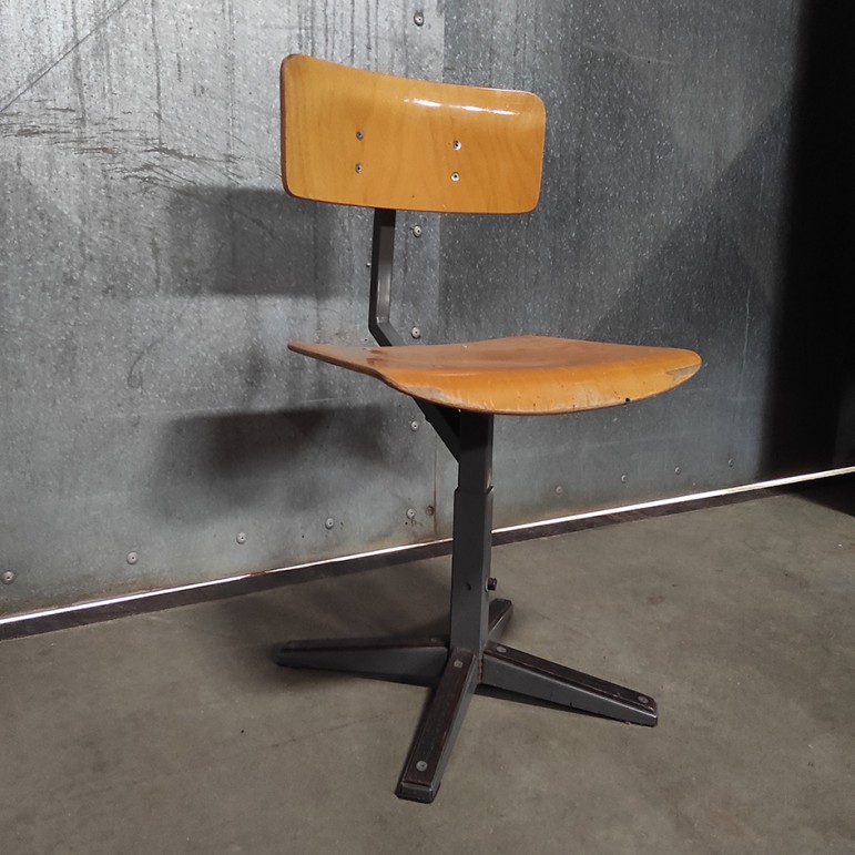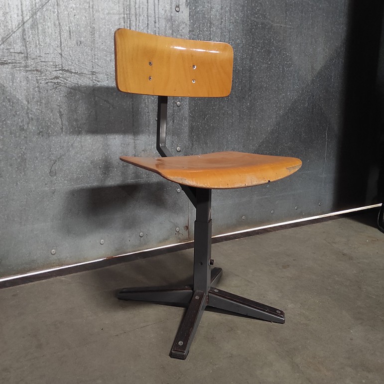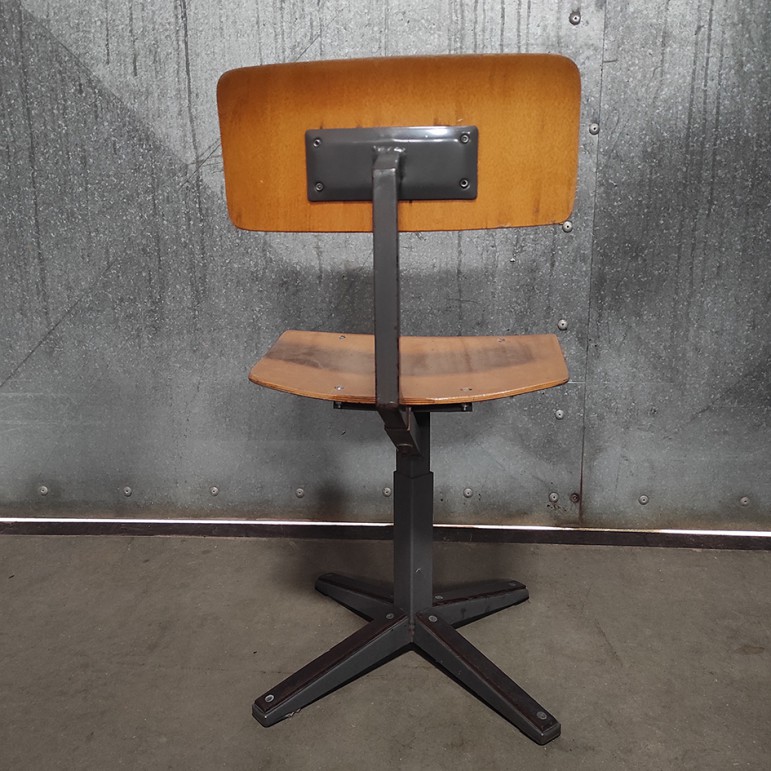 De stoel staat op een metalen voet, is in hoogte verstelbaar en heeft een eenvoudige houten rugleuning. Geen overbodige franjes, wel een duidelijke vorm en een robuuste opbouw zoals je die kent van oude schoolstoelen en atelierstoelen.